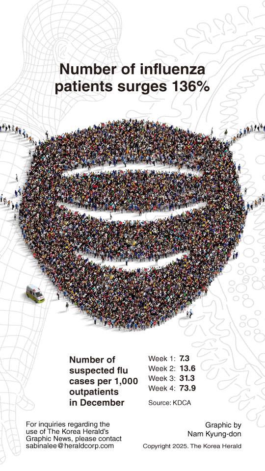 According to the Korea Disease Control and Prevention Agency, the influenza-like illness, or ILI, rate — a measure of suspected flu patients among 1,000 outpatients at 300 sample monitoring medical institutions nationwide — surged to 73.9 between Dec. 22 and 28 last year.